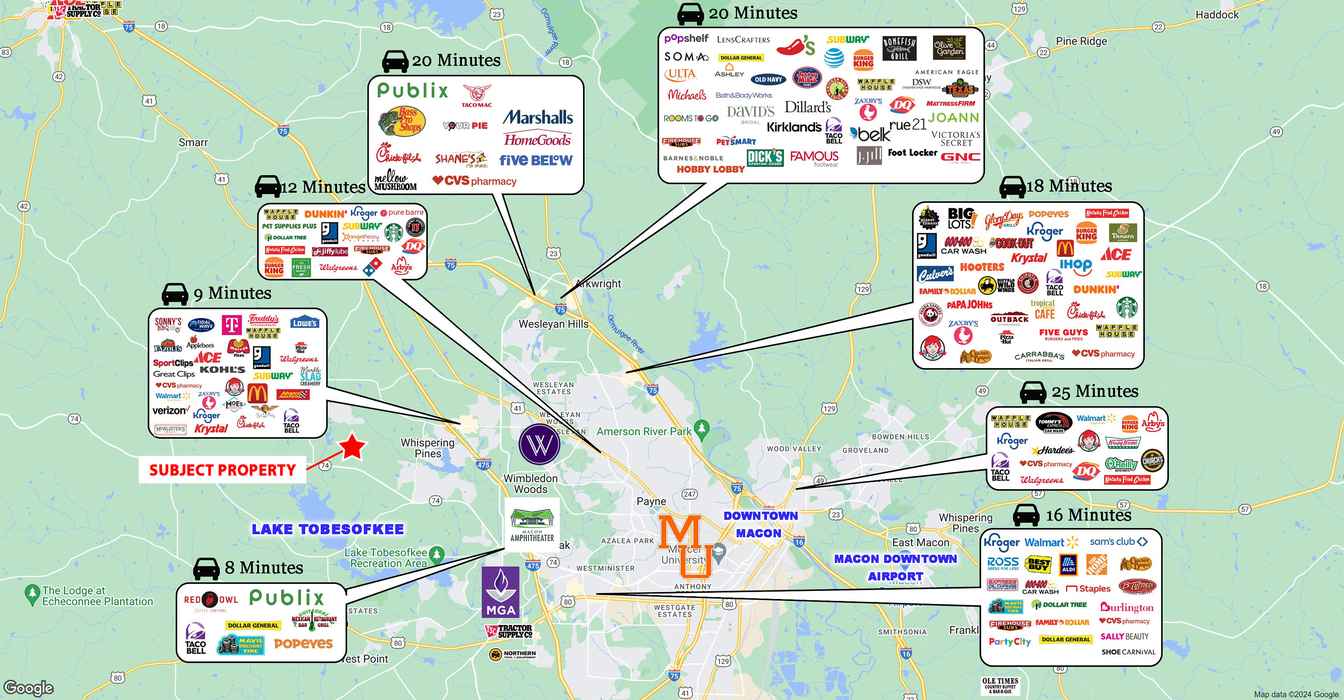 Property is located on Thomaston Road (GA-74) in between Lake Tobesofkee, Barrington Hall golf communities, and Zebulon road; all with high-income households. The land is in close proximity to the Publix anchored Tobesofkee Crossing Shopping Center, Wesleyan College, Idle Hour Country Club, and I-475.