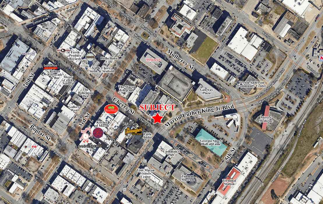 Nearby businesses in the area include the Georgia Sports Hall of Fame, Theatre Macon, the Tubman Museum, Terminal Station, Greater Macon Chamber of Commerce, NewTown Macon, City Hall, and the Macon-Bibb County Courthouse.