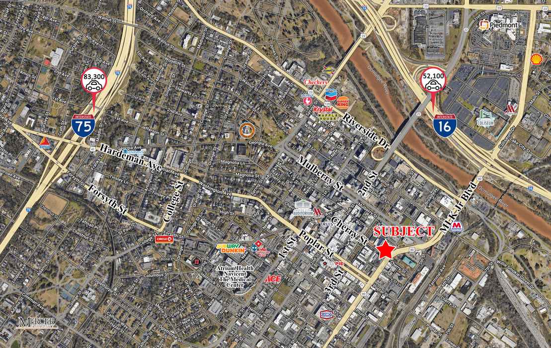 Direct access via Riverside Drive and Martin Luther King Jr Boulevard. Less than 1 mile from Interstate 75. Position your business in the heart of Macon’s thriving downtown district. This location offers unmatched visibility and walkability, surrounded by cultural landmarks, entertainment venues, and essential services. Located just steps from the Georgia Sports Hall of Fame (the nation’s largest sports museum) and the Tubman Museum (the Southeast’s largest African American art and history museum). Atrium Health Navicent and Piedmont Macon Medical Center are also nearby, providing strong healthcare infrastructure and daytime traffic. This location is ideal for retail, dining, or professional services seeking high foot traffic and proximity to Macon’s most iconic destinations.