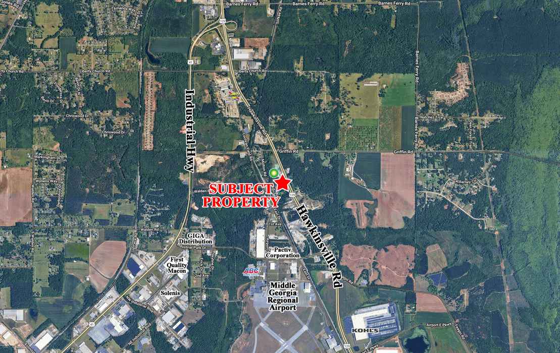Located at the corner of Hawkinsville Road and Walden Road, on the primary corridor between Macon and Warner Robins. Nearby businesses include BP, Foster Auto Sales, Sound Source, Orkin, Bibb Machinery Sales, Air Temperature Control, and many other retail and light industrial businesses.