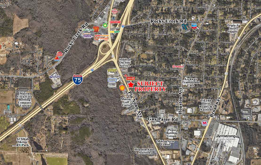 Located at the corner of Pio Nono Avenue and Dewey Street, with easy access to I-75. Nearby businesses include Macon Golf Carts, JJ Fish & Chicken, Rutherford Trophies, Fast Tires, Penske Truck Rental, Waffle House, Solideal On-Site Service, and other convenience, retail, and quick service restaurants.