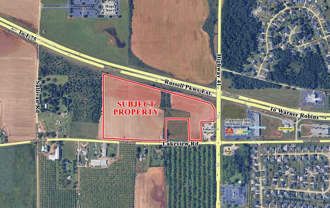 This 33.2 Acre parcel is strategically located at the corner of Russell Parkway Extension and Highway 41 in Peach County, within the city limits of Warner Robins. Property has previously been approved for one full access point on Russell Parkway Extension, as well as four Right-In, Right-Out curb cuts. See Exhibit A in brochure for curb cut locations. There is also a conceptual of outparcels along Russell Parkway Extension, see Exhibit B in brochure.