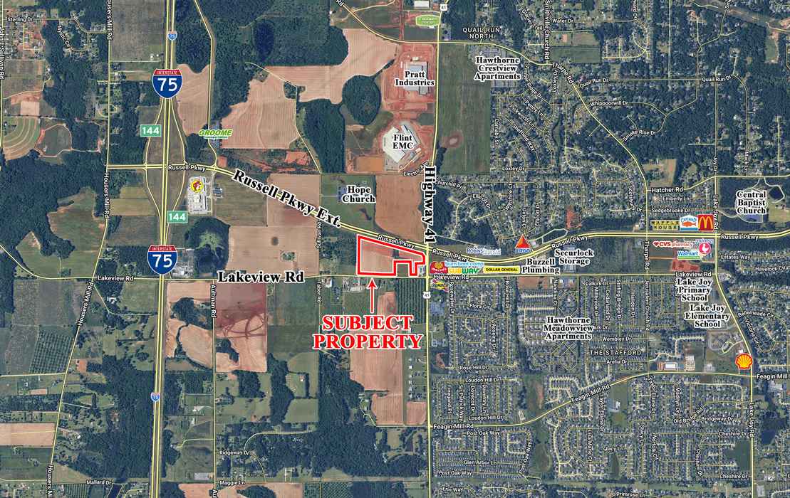 Parcel is situated at the corner of Russell Parkway Extension and Highway 41, just 1.3 miles from I-75. Businesses in the area include Buc-ee’s, Plantation Mill Shopping Center (54,302 SF retail center), Dollar General Robins Financial Credit Union, Buzzell Plumbing, Heating, & Air, Flint Electrical Membership Corporation, Pratt Industries, and Groome Transportation, as well as other retail and restaurant establishments.