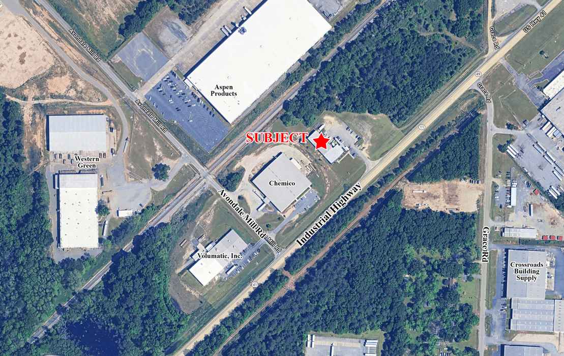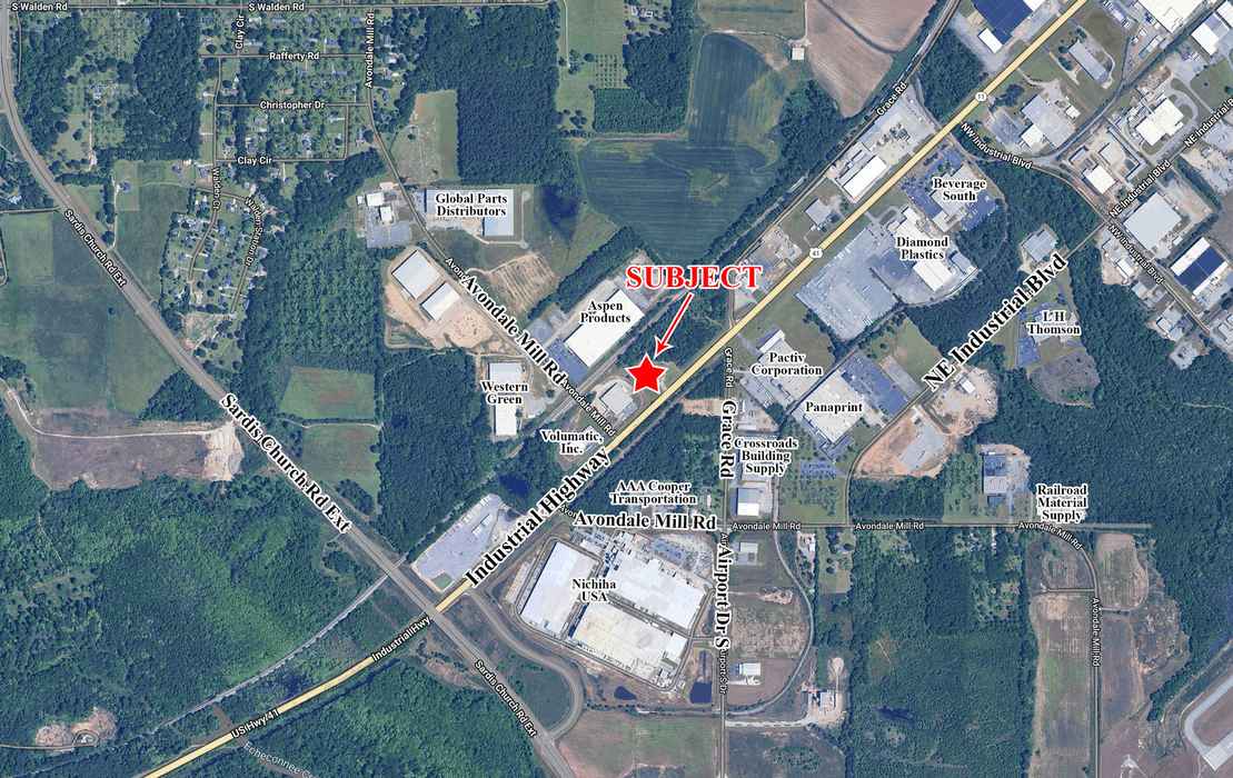 Neighbors include Chemico LLC, Boyd’s Industrial Woodwork, Volumatic, Aspen Products Inc., Diamond Plastics, Lopaco, Beasley Flooring Products, Nichiha Corporation, Middle Georgia Regional Airport & Airport South Industrial Park.